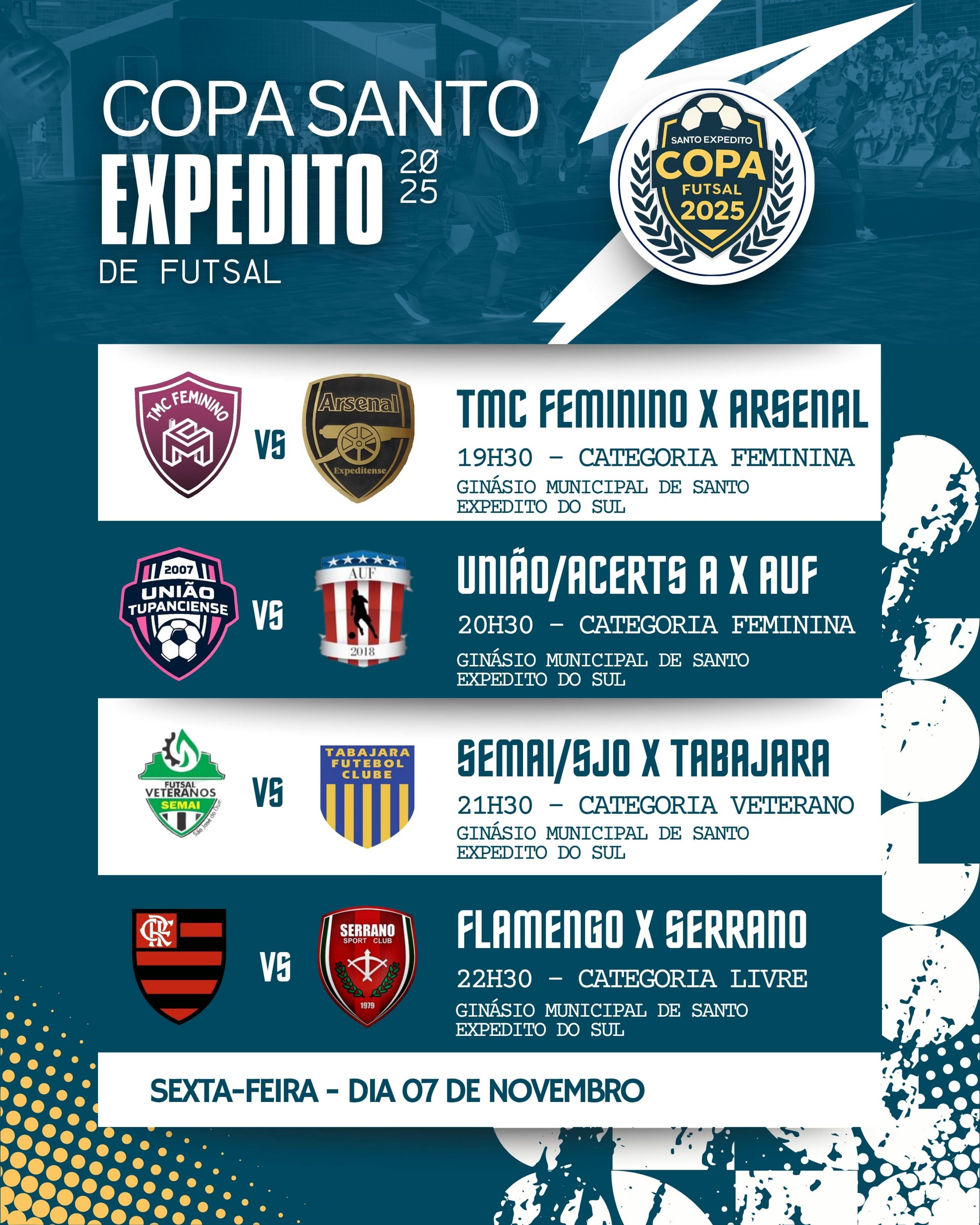 Confira os resultados dos jogos da Copa Santo Expedito de Futsal, realizados na última quarta-feira, dia 05 de novembro. Nesta sexta-feira, dia 07 de novembro, ocorrem mais 4 partidas com início às 19h30min.