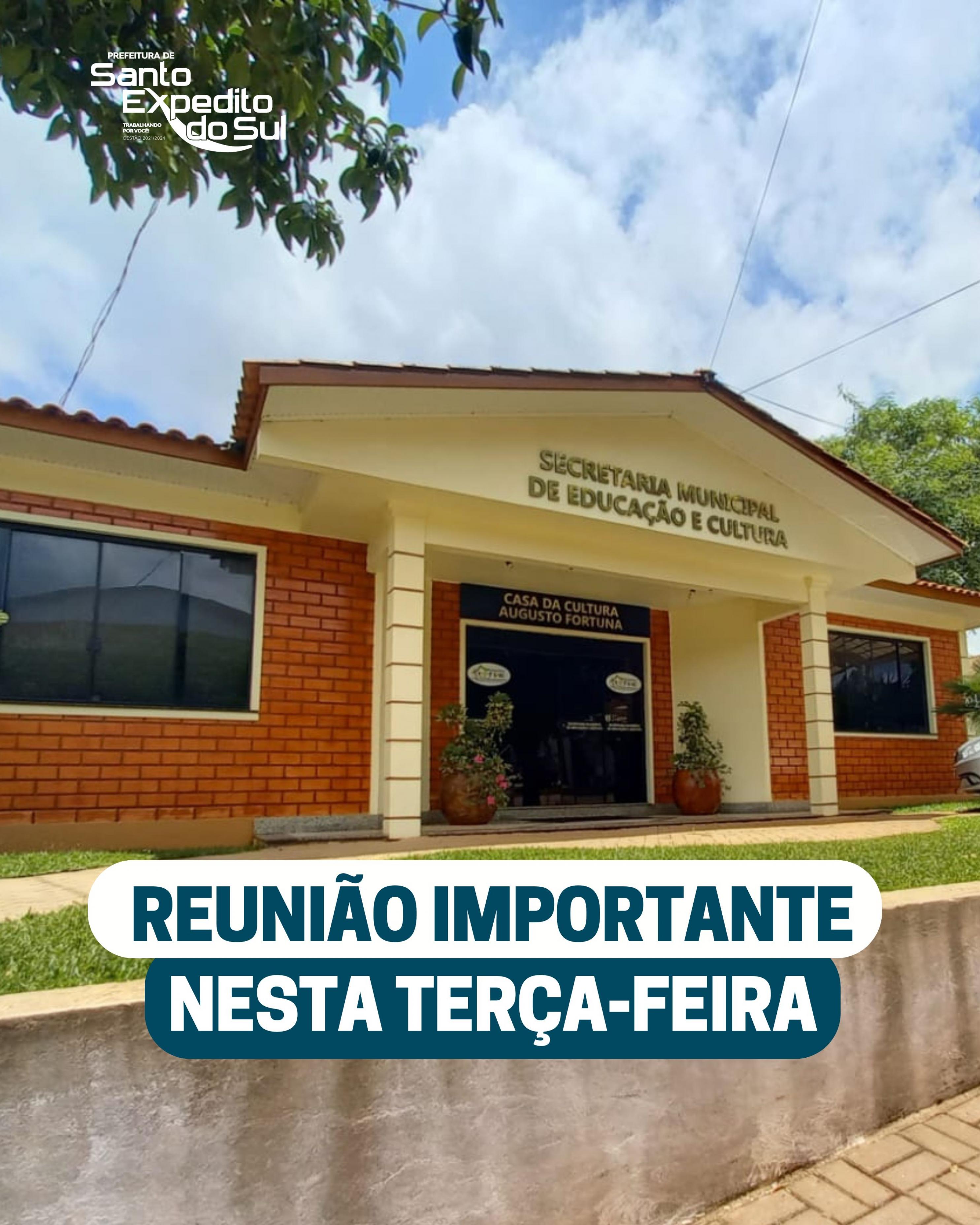 A Secretaria Municipal de Educação de Santo Expedito do Sul convida os pais e responsáveis pelos alunos da sede do município para participarem de uma reunião nesta terça-feira, dia 11 de novembro, às 13h30min, na Casa da Cultura Augusto Fortuna.