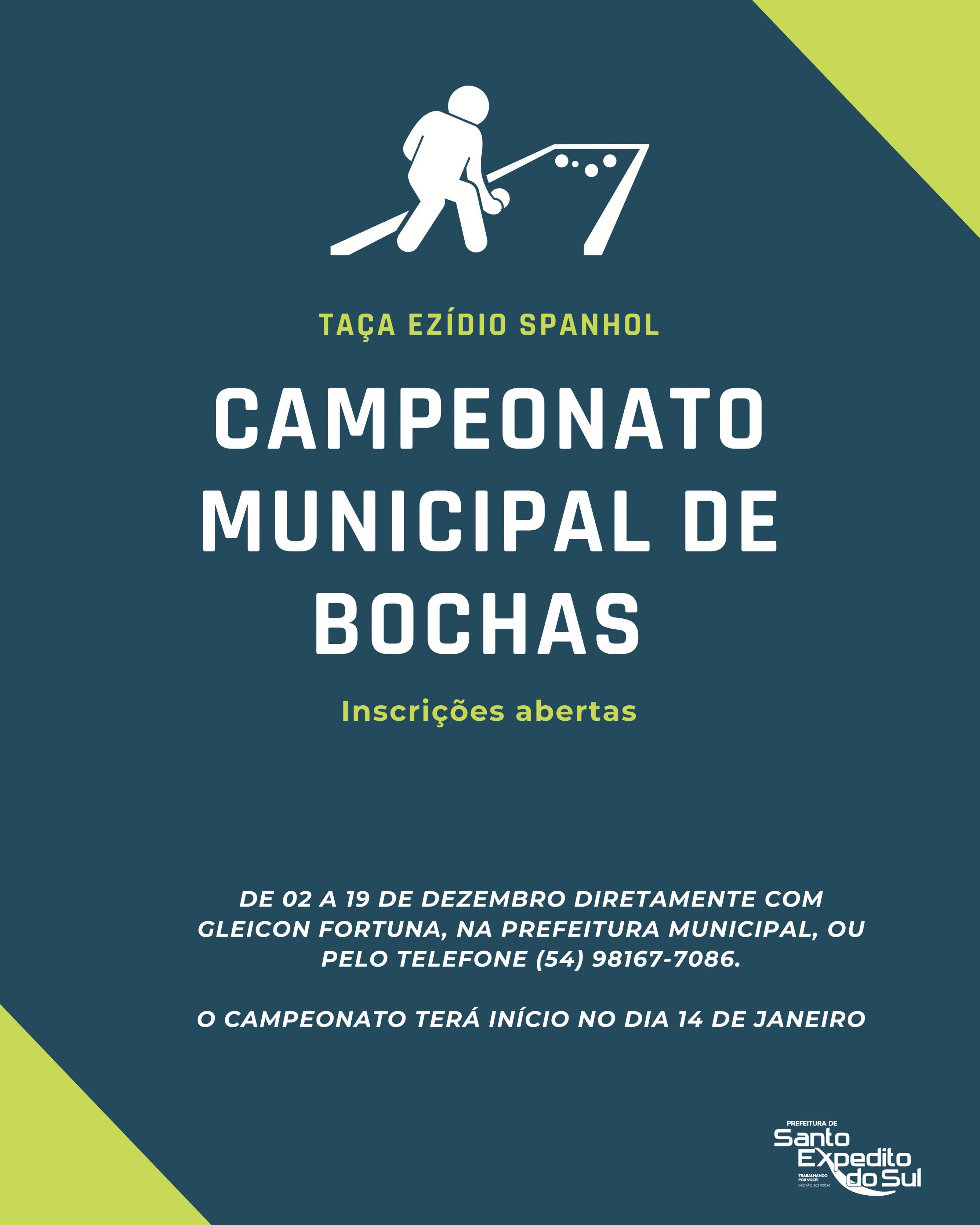 A Administração Municipal de Santo Expedito do Sul, por meio do Conselho Municipal de Desportos (CMD), anuncia que estão abertas as inscrições para o Campeonato Municipal de Bochas 2025. As equipes devem ser formadas por no mínimo 4 e no máximo 5 jogadores, sendo obrigatório que todos tenham o título eleitoral registrado em Santo Expedito do Sul.
