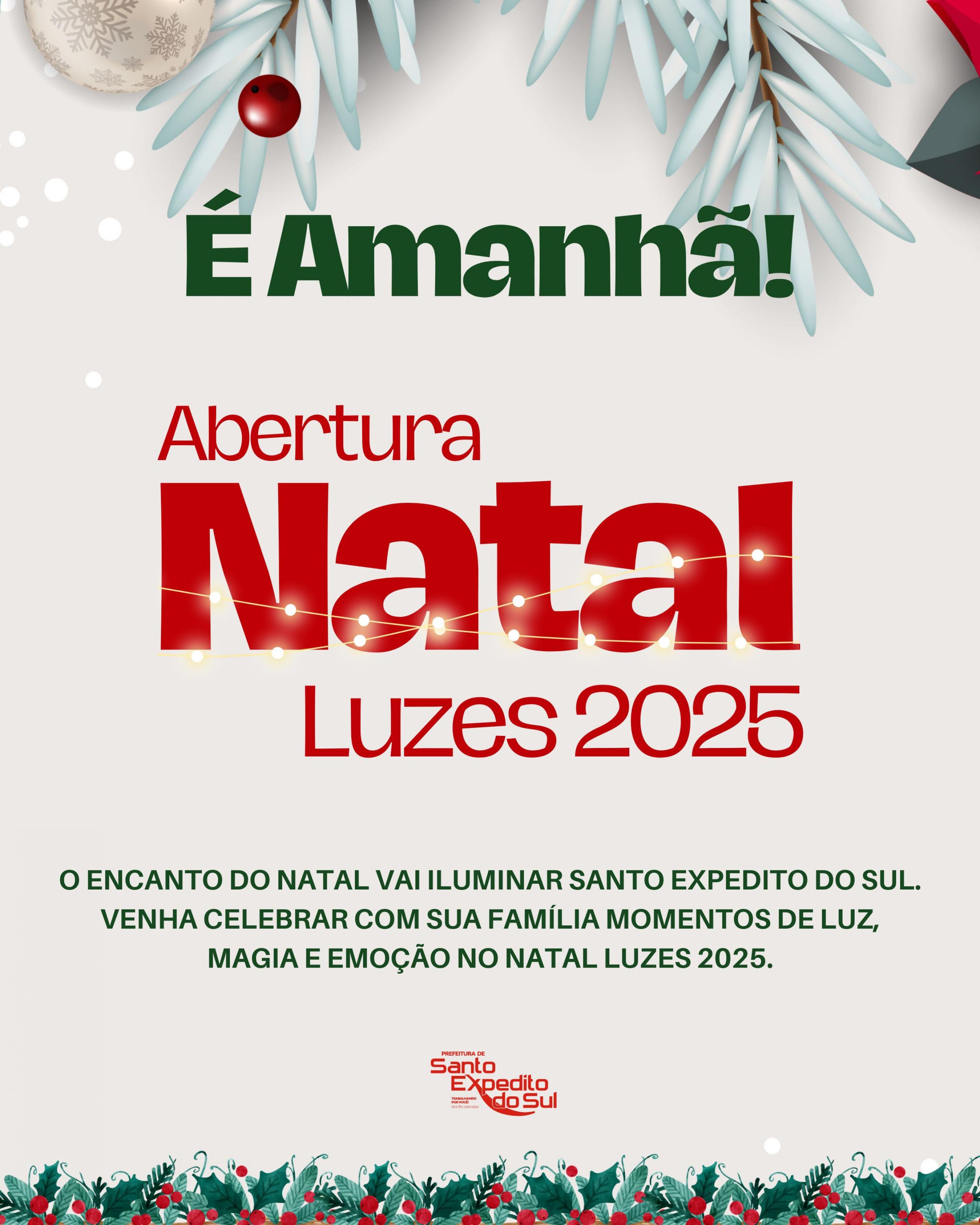A Administração Municipal de Santo Expedito do Sul convida toda a comunidade para prestigiar a abertura oficial do Natal Luzes 2025, que será realizada amanhã, sexta-feira, dia 05 de dezembro, a partir das 20h, na Rua Coberta.