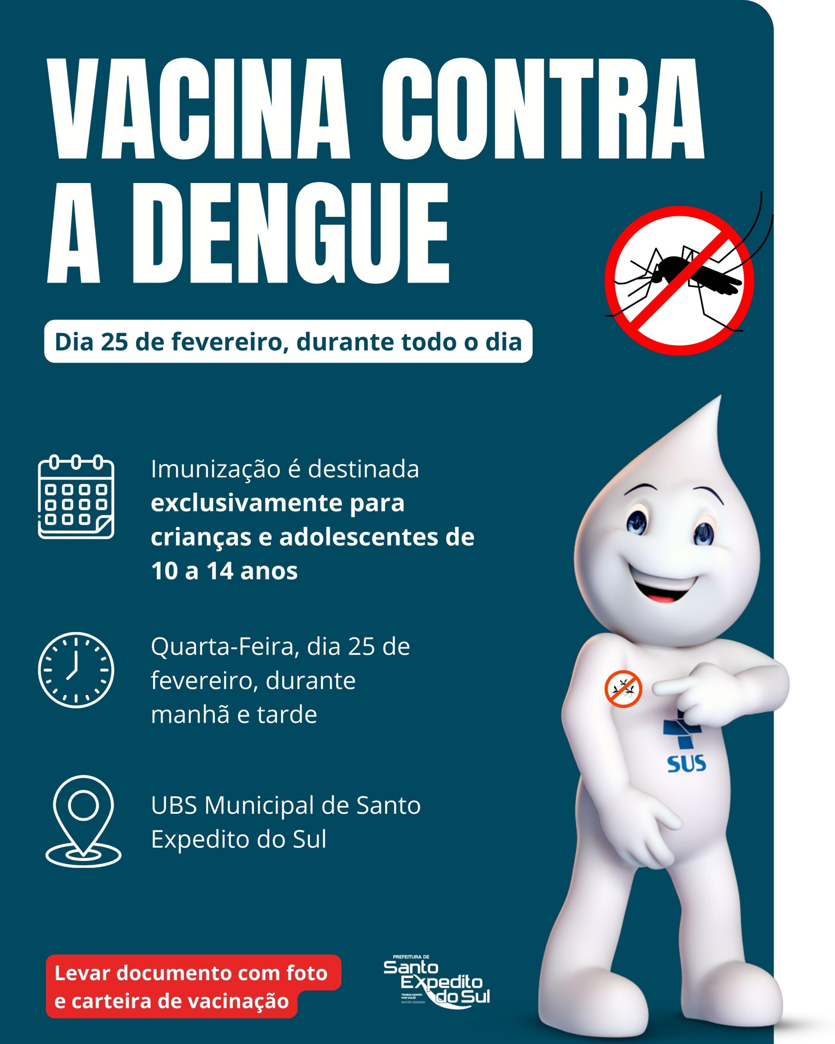 A Prefeitura Municipal de Santo Expedito do Sul, por meio da Secretaria Municipal de Saúde, realizará na próxima quarta-feira, dia 25, a vacinação contra a dengue no município.