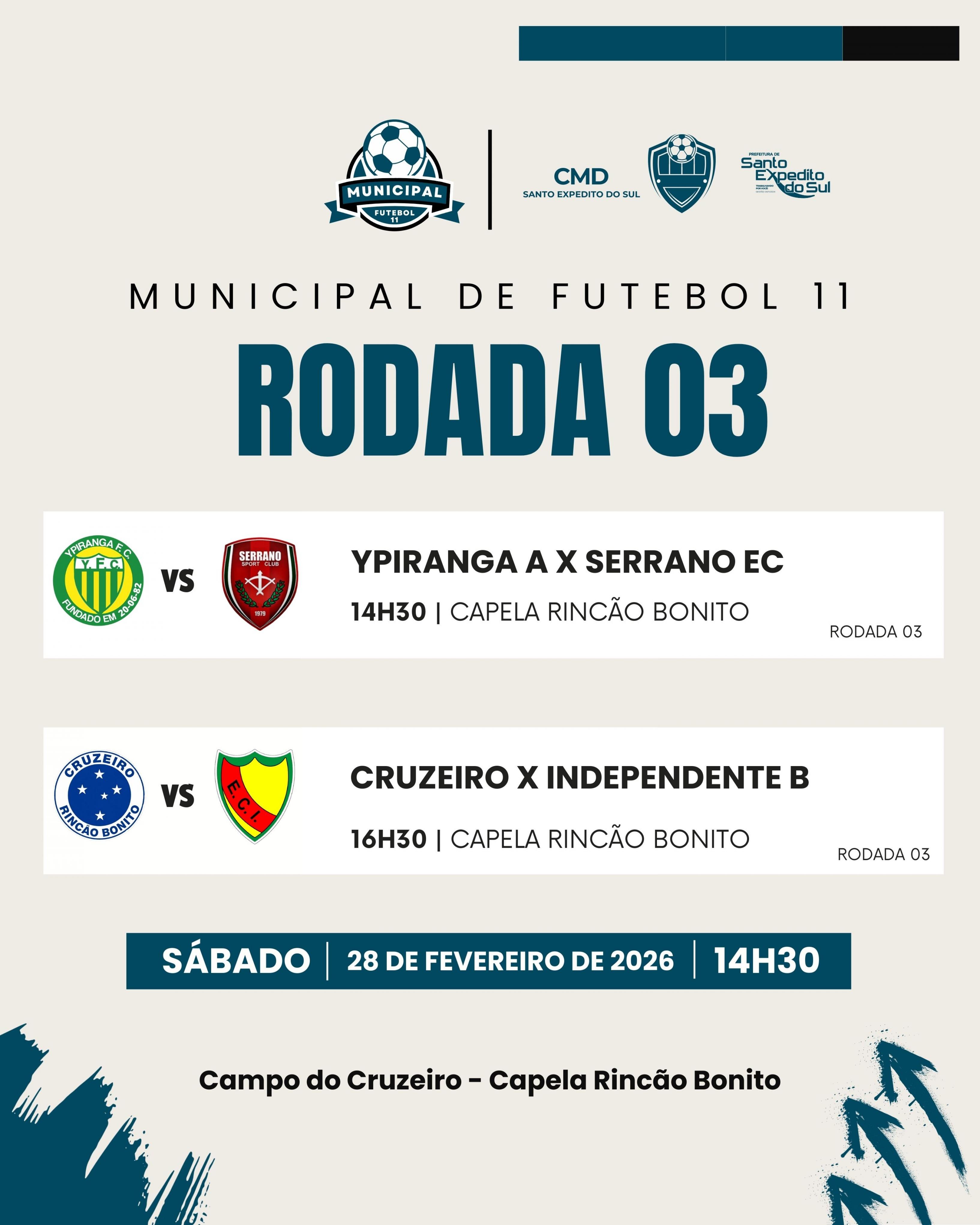 O Campeonato Municipal de Futebol 11, Taça Altemir José Tacca terá o encerramento da primeira fase neste sábado (28), com duas partidas que serão disputadas no Campo da Comunidade da Capela Rincão Bonito, em Santo Expedito do Sul.