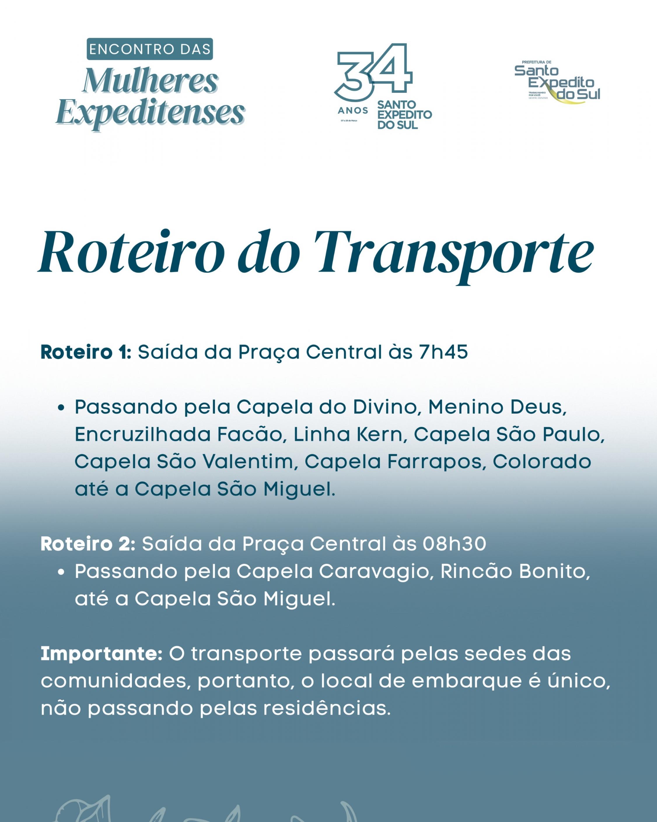 A administração municipal de Santo Expedito do Sul promoverá transporte gratuito para a abertura da programação de aniversário de 34 anos. O evento que abre as festividades, acontece neste sábado, dia 07 de março, com o tradicional encontro das mulheres expeditenses na Capela São Miguel. Confira o roteiro do transporte: