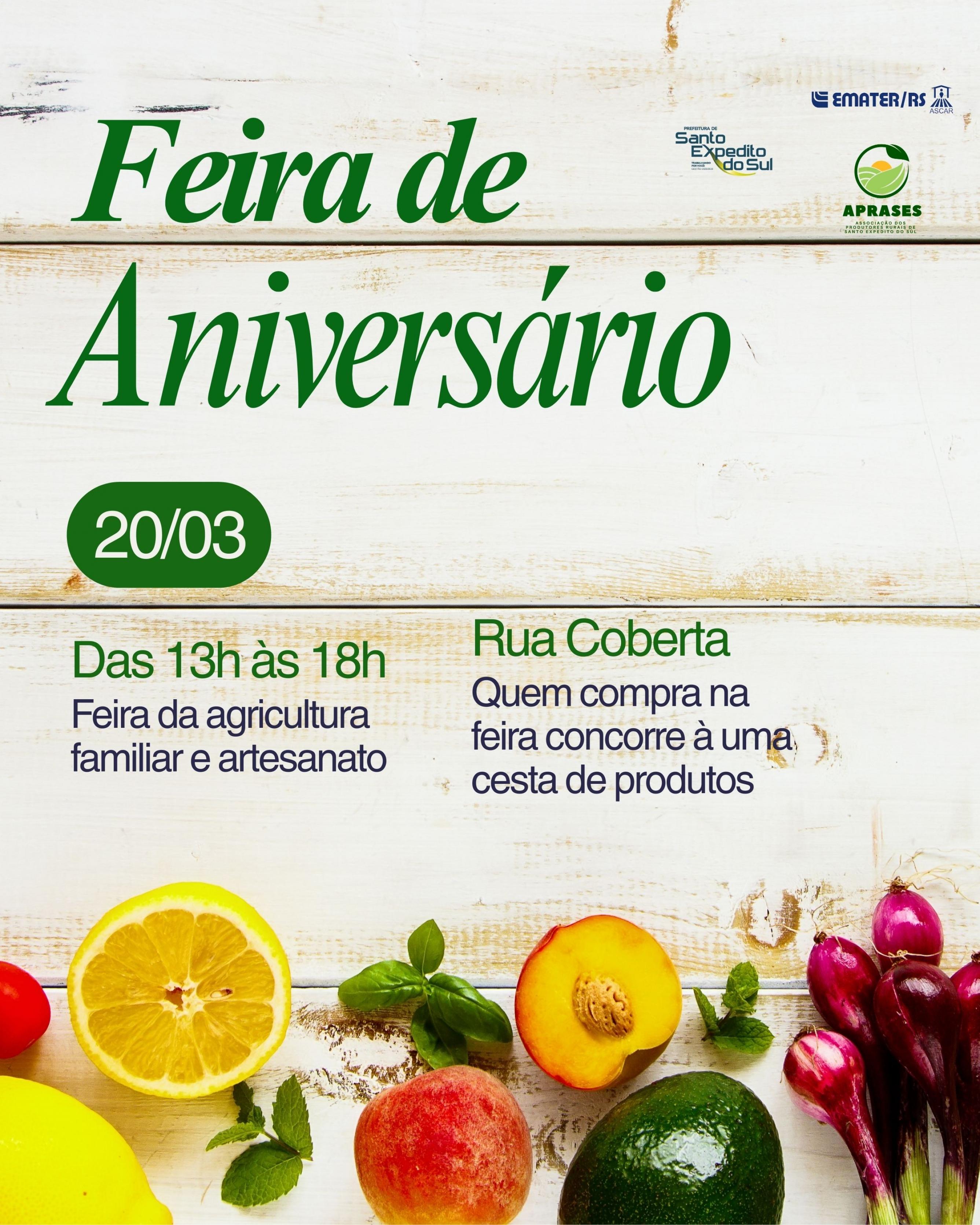 Nesta sexta-feira, dia 20 de março, ocorre a edição especial da feira da agricultura familiar e artesanato. Os produtores estarão disponíveis para comercializar os seus produtos na Rua Coberta, das 13h às 18h. A comunidade está convidada a prestigiar e concorrer à uma cesta de produtos.