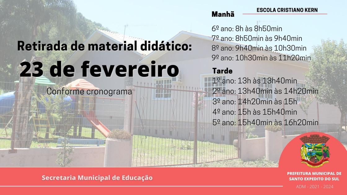 Conforme enquadramento da região na bandeira preta, definido pelo Governo Estadual, a Escola Municipal de Ensino Fundamental Cristiano Kern fez uma alteração no protocolo de retirada dos livros didáticos do ano letivo de 2021, que acontecerá na próxima terça-feira, dia 23 de fevereiro. A ação foi necessária, com o intuito de não aglomerar pessoas na escola em virtude da pandemia COVID-19 e, com isso, a entrega obedecerá a um cronograma de horários.