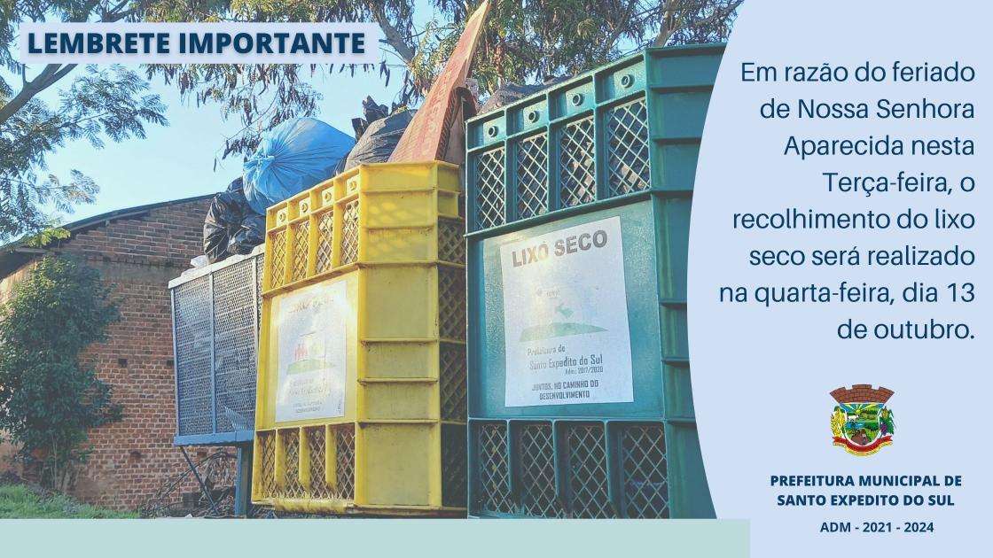 A Secretaria Municipal de Urbanismo informa uma mudança no recolhimento de resíduos urbanos para esta semana. Em razão do feriado de Nossa Senhora Aparecida, e do ponto facultativo nas repartições públicas, o trabalho de coleta do lixo seco ocorrerá na quarta-feira, dia 13 de agosto.