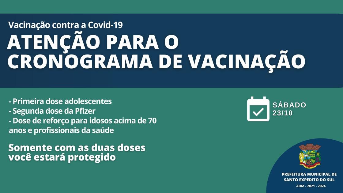 A Secretaria Municipal de Saúde intensifica a campanha de vacinação da população expeditense. Neste sábado, 22 de outubro, ocorrerá a aplicação da primeira dose para adolescentes de 12 à 17 anos, segunda dose da Pfizer, e dose de reforço em idosos e profissionais de saúde.