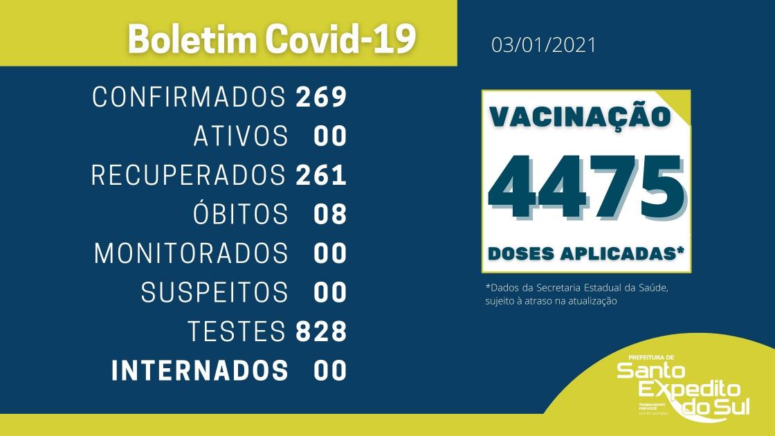 A Secretaria Municipal de Saúde atualizou o Boletim Epidemiológico do Coronavírus nesta segunda-feira, 03 de janeiro, e o município segue sem nenhum caso ativo.