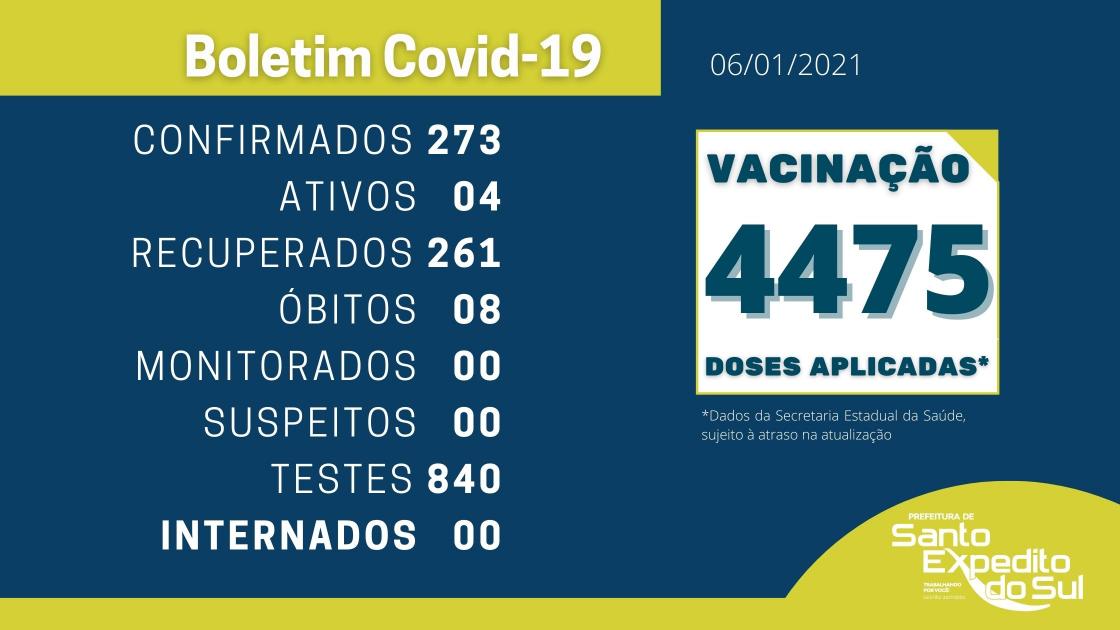 Santo Expedito do Sul registra até o momento 273 casos confirmados desde o início da pandemia, 08 óbitos foram registrados, e no momento não há pacientes monitorados, nem sob suspeita. São contabilizados 261 pacientes recuperados, e não há pacientes internados em hospitais. Foram realizados 840 testes até o momento.