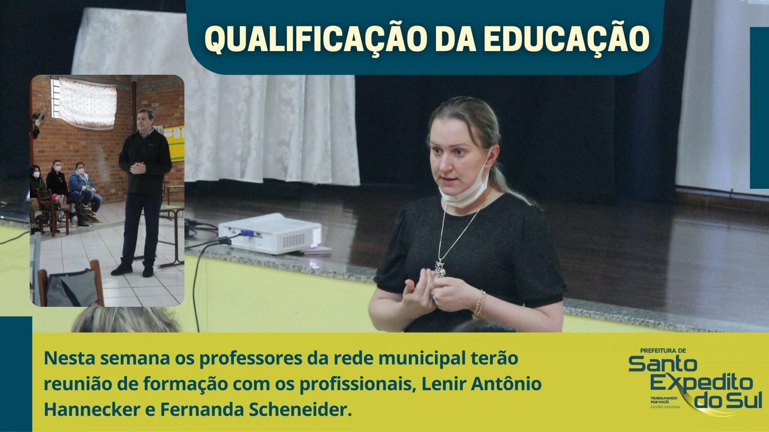 Nesta quinta e sexta-feira, dias 03 e 04 de fevereiro, estão programadas reuniões de formação com os professores da rede municipal, com o professor Lenir Antônio Hannecker, e com a Psicopedagoga Fernanda Schneider.