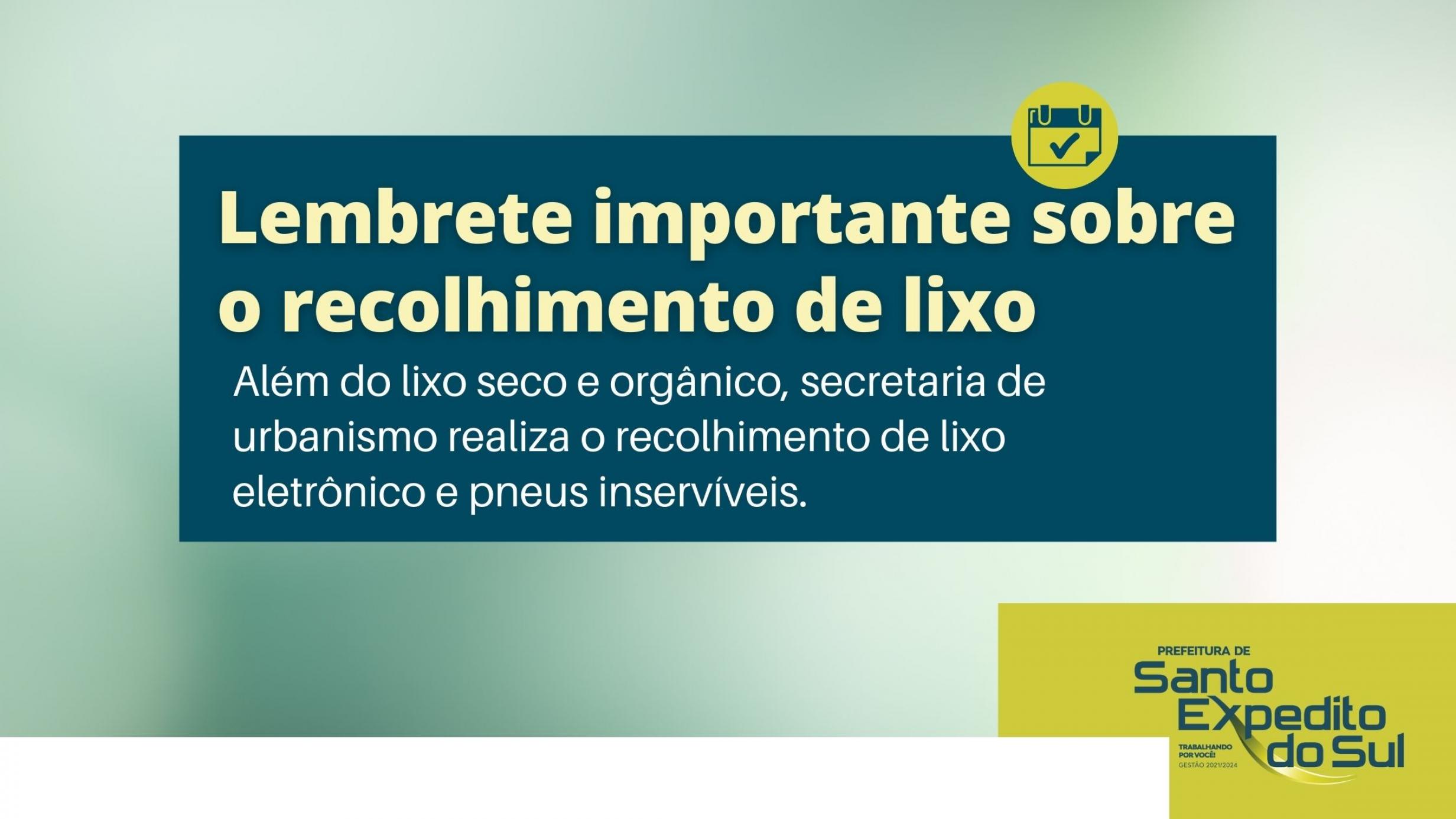 A Secretaria Municipal de Urbanismo faz um lembrete importante sobre a destinação dos resíduos urbanos e rurais, de forma correta e nos dias corretos. O setor realiza recolhimento de lixo seco e orgânico, além de eletrônicos e pneus de forma frequente.