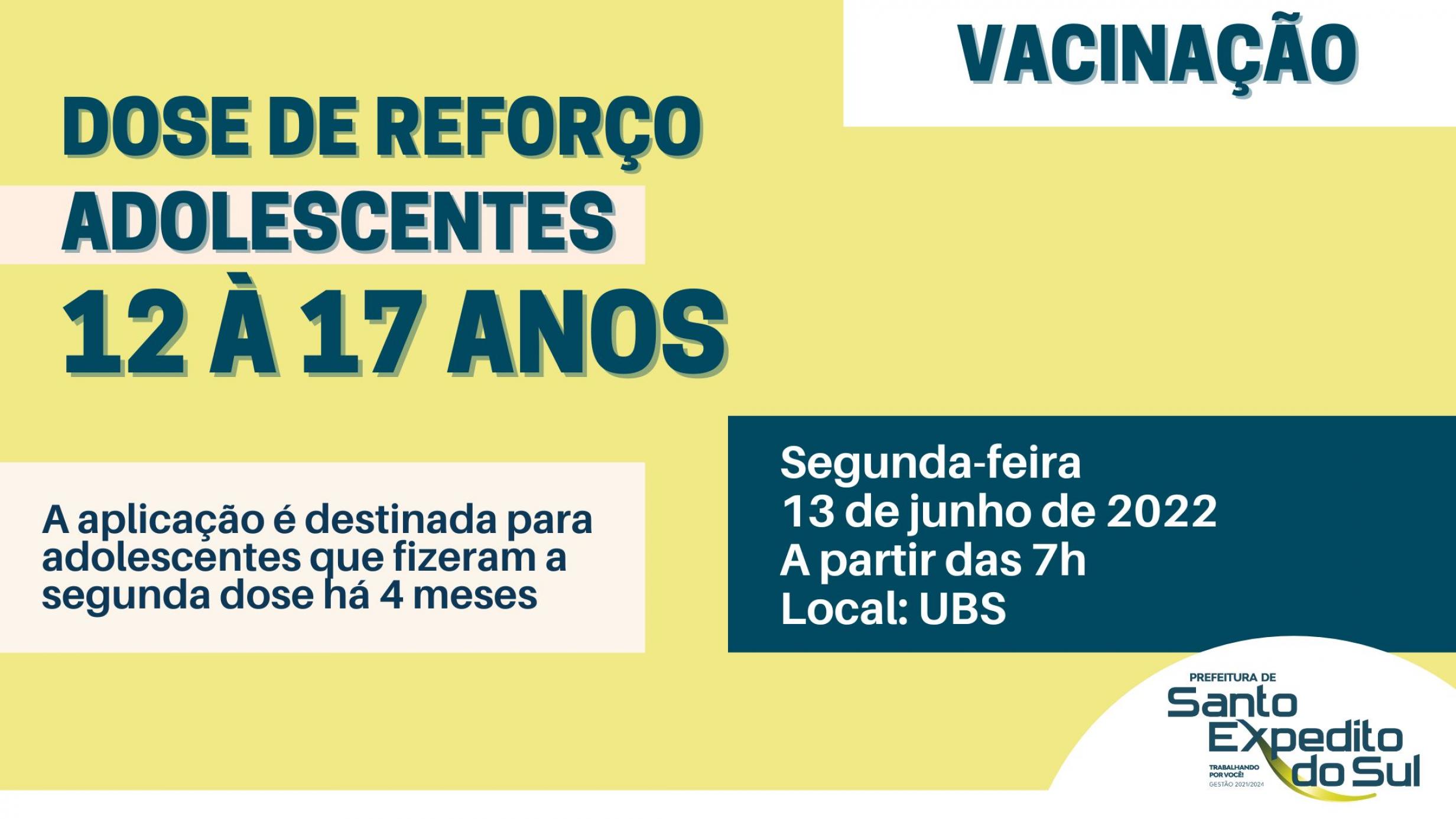 A Secretaria Municipal de Saúde de Santo Expedito do Sul intensifica a vacinação infantil e adulta contra a Covid-19. Nesta segunda-feira, dia 13 de junho, com aplicação da dose de reforço em adolescentes, na Unidade Básica de Saúde do município, durante todo o dia.