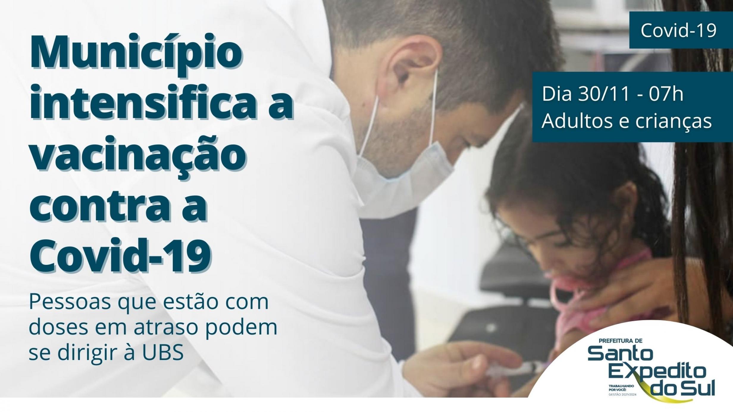 A Secretaria Municipal de Saúde de Santo Expedito do Sul intensifica a vacinação de adultos e crianças contra a Covid-19. Nesta quarta-feira, dia 30 de novembro, serão aplicadas as doses contra a Covid-19 para crianças e adultos, que possuem doses em atraso.