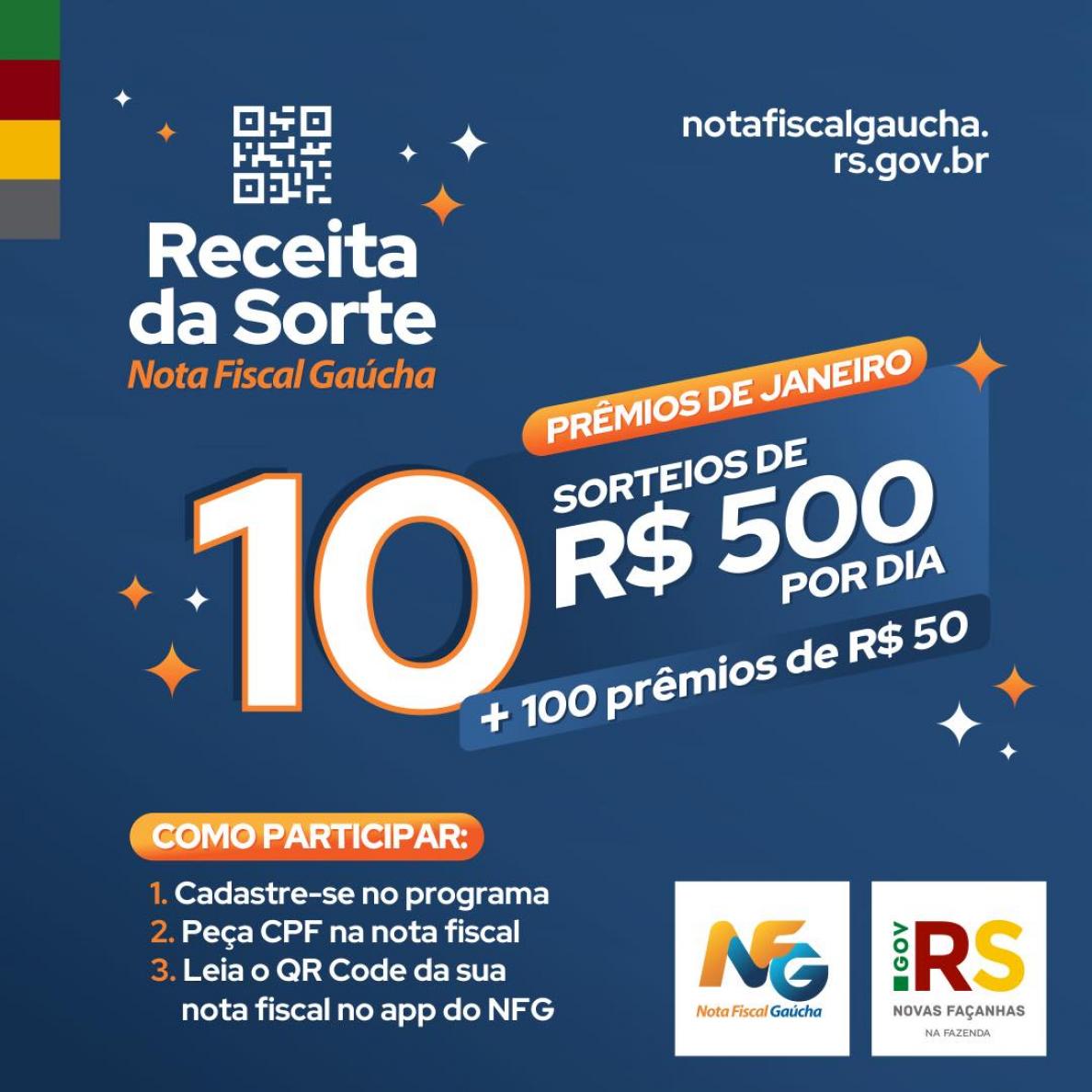 O programa Nota Fiscal Gaúcha (NFG) tem novidades em 2023. Os contribuintes concorrem, durante todo o mês de janeiro, a 10 prêmios diários de R$ 500 e 100 de R$ 50.