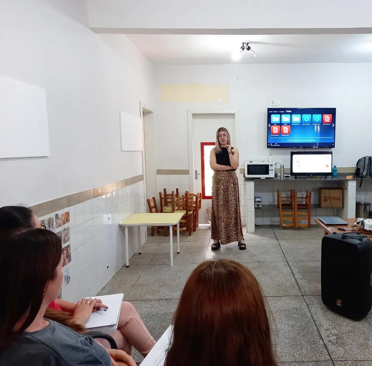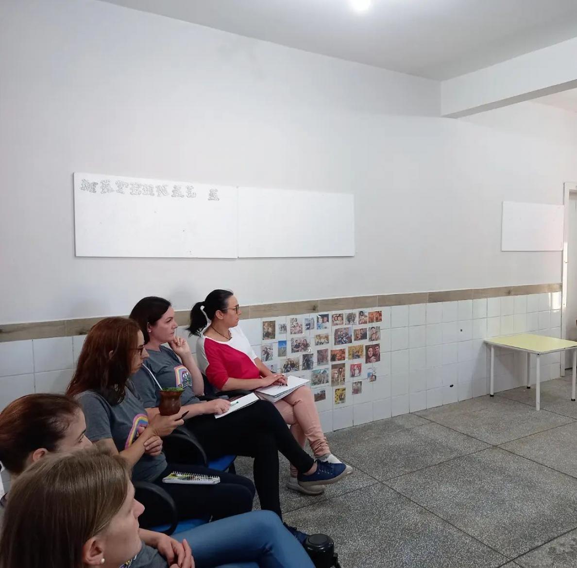 Carine é Mestra em Educação pela Universidade Federal da Fronteira Sul - professora pesquisadora na área das infâncias, culturas infantis, educação popular, metodologia de ensino e avaliação processual. A reunião ocorreu na sede da Escola Infantil.