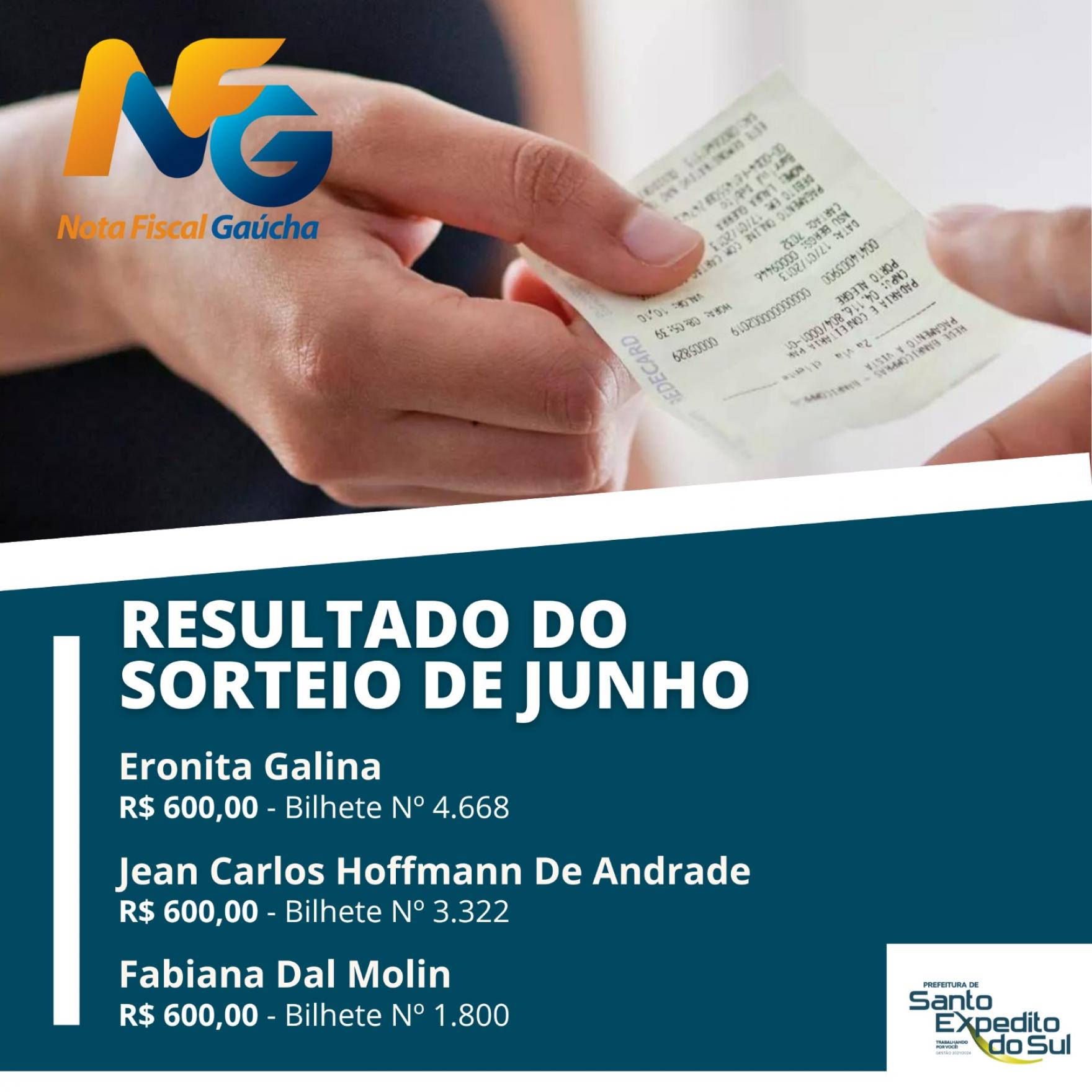 O município de Santo Expedito do Sul divulga, por meio da Secretaria Municipal da Fazenda, o resultado do sorteio do Programa Nota Fiscal Gaúcha do mês de maio. Os ganhadores do mês foram Eronita Galina, Jean Carlos Hoffmann De Andrade, e Fabiana Dalmolin.