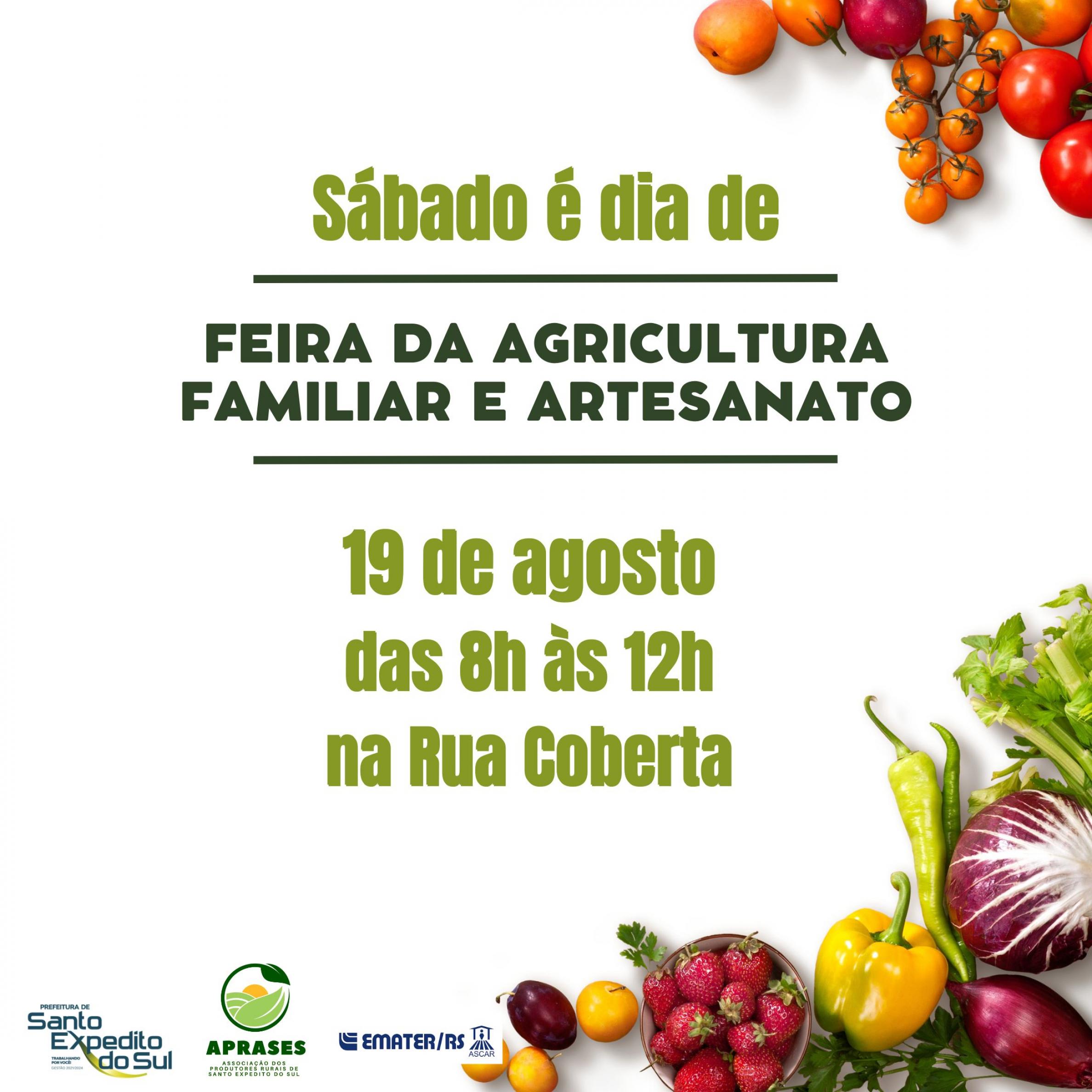 Quem está aguardando para adquirir produtos coloniais, frutas e verduras, além de artesanato, pode participar de mais uma edição da Feira da Agricultura Familiar e Artesanato, que ocorre neste sábado, dia 19 de agosto. Os produtores estarão disponíveis para comercializar os seus produtos na Rua Coberta, a partir das 08h até às 12h. A comunidade está convidada a prestigiar.