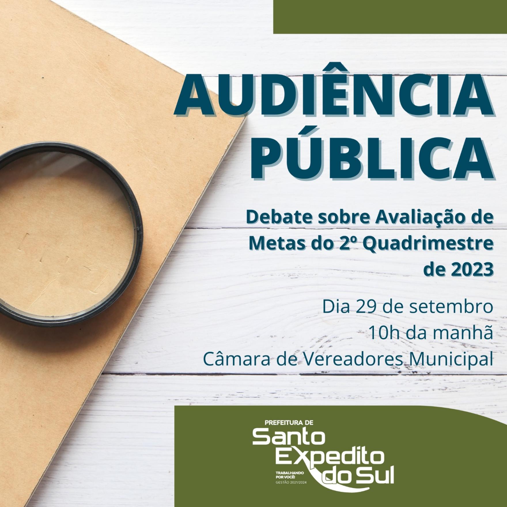 O Prefeito Municipal de Santo Expedito do Sul, convoca os interessados e a população em geral, para participar da Audiência Pública para debate sobre avaliação de Metas do 2º Quadrimestre de 2023, a qual realizar-se-á no próximo dia 29 de setembro de 2023, às 10h, junto ao auditório da Câmara de Vereadores.