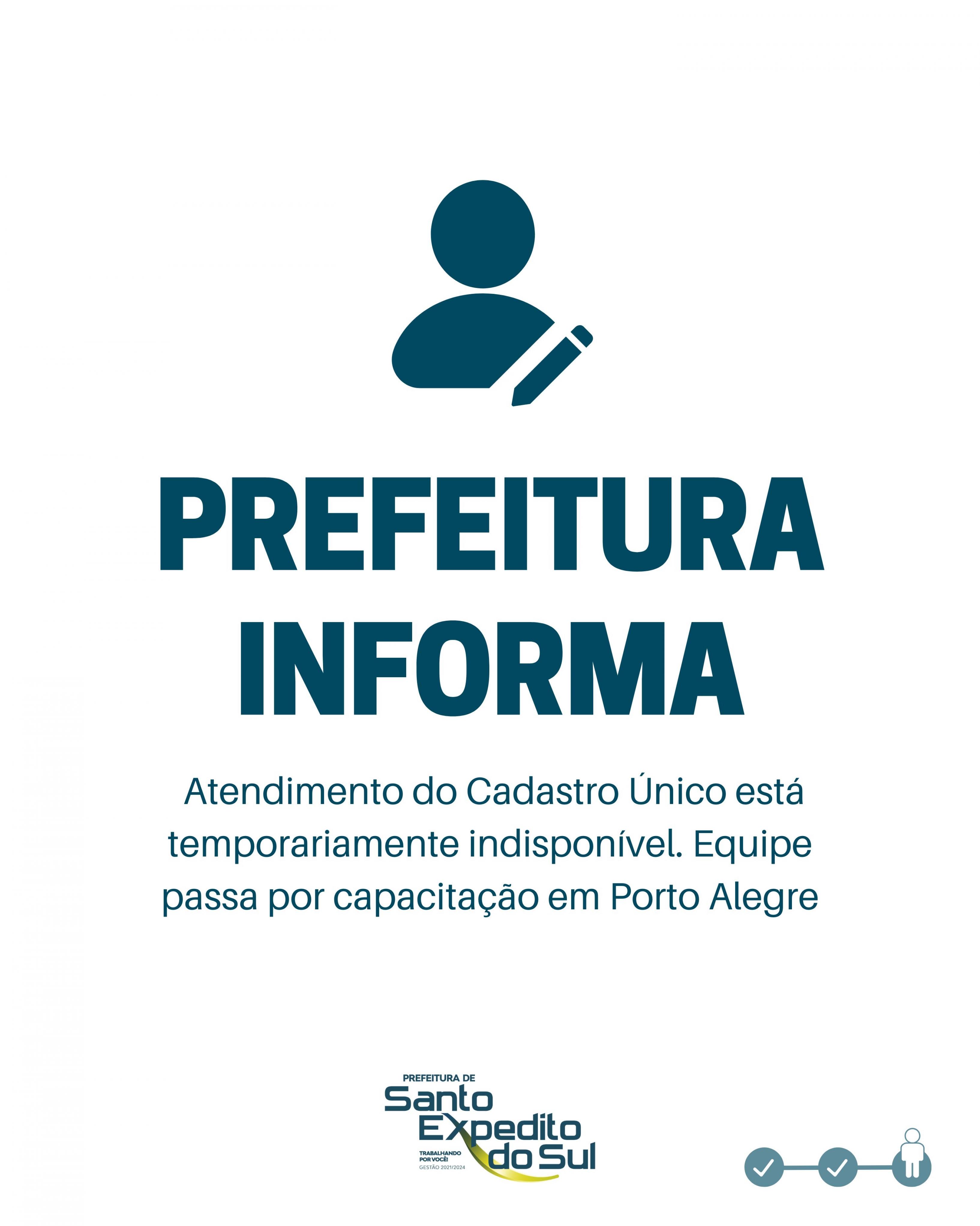 A Prefeitura de Santo Expedito do Sul, por meio da Secretaria Municipal de Assistência Social, informa que o atendimento no setor de cadastro único está suspenso nesta quarta, quinta e sexta-feira. A indisponibilidade se deve à participação da equipe em uma capacitação em Porto Alegre nesta semana.