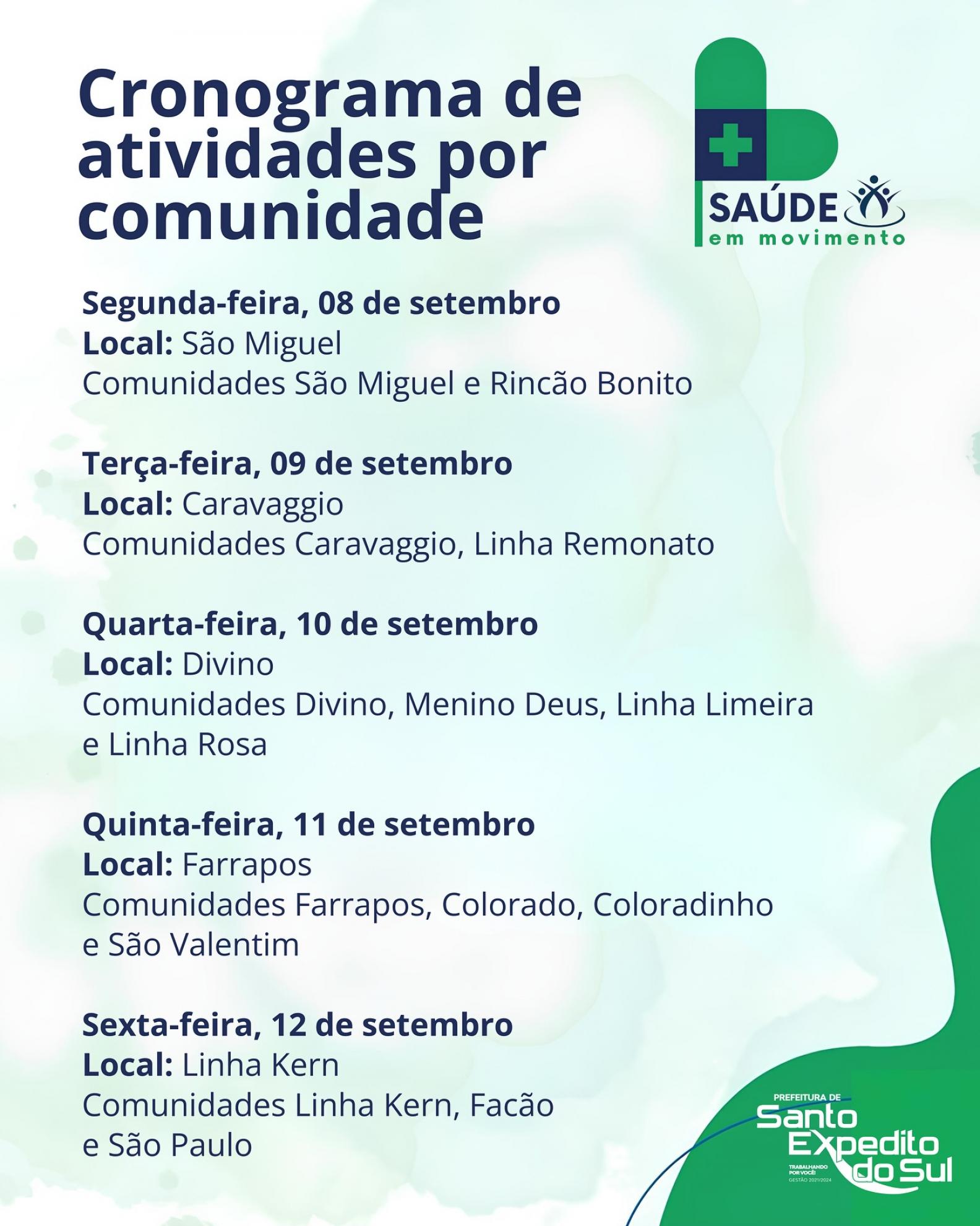 A semana começa com foco na promoção da saúde e qualidade de vida em Santo Expedito do Sul. Nesta segunda-feira, dia 08 de setembro, iniciam os encontros nas comunidades com o Programa Saúde em Movimento, uma iniciativa voltada à prevenção de doenças e incentivo às práticas saudáveis.