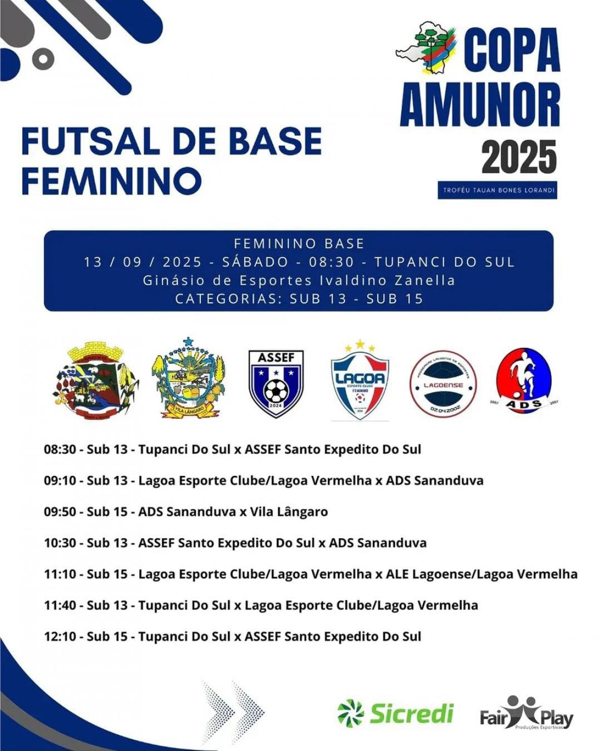 A equipe da ASSEF Santo Expedito do Sul estará em quadra neste sábado, dia 13 de setembro, para mais uma rodada da Copa Amunor 2025, Troféu Tauan Bones Lorandi. Os jogos acontecem no Ginásio de Esportes Ivaldino Zanella, em Tupanci do Sul, reunindo equipes das categorias Sub-13 e Sub-15 do futsal feminino regional.