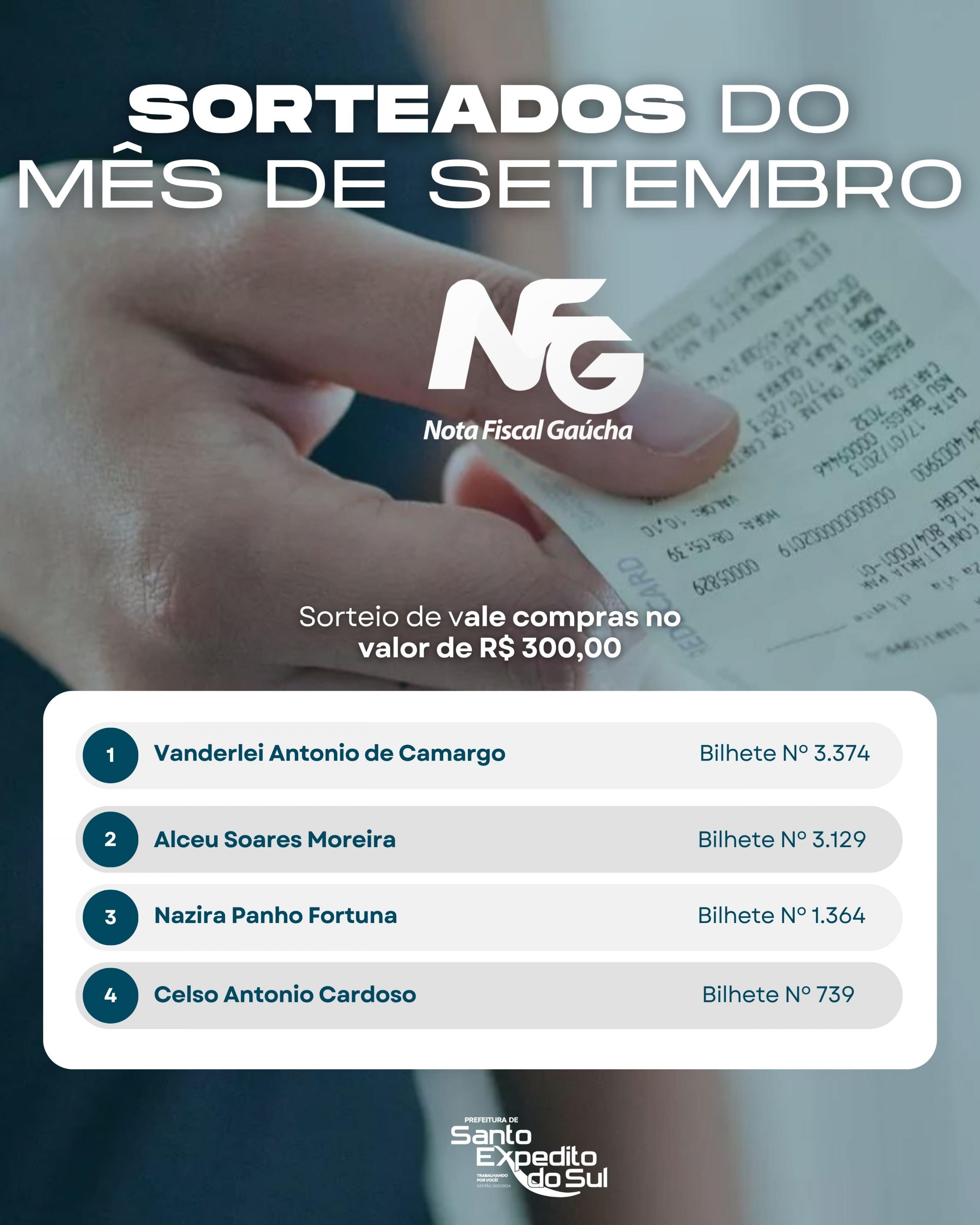 A Administração Municipal de Santo Expedito do Sul, por meio da Secretaria da Fazenda, divulga os ganhadores do Programa Nota Fiscal Gaúcha (NFG) referentes ao sorteio do mês de setembro de 2025. Ao todo, quatro contribuintes do município foram contemplados com vales-compras no valor de R$ 300,00 cada.