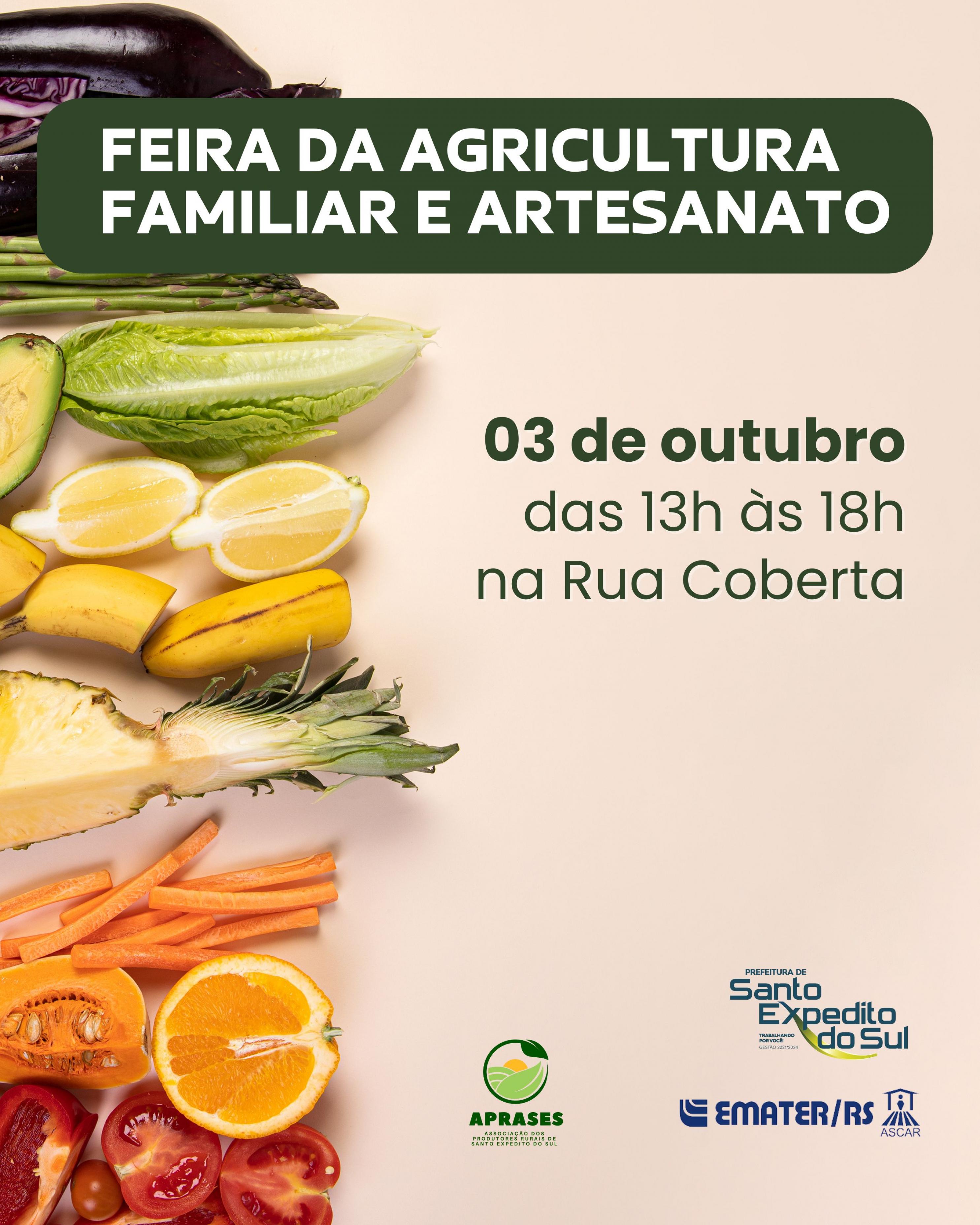 Nesta sexta-feira, dia 03 de outubro, ocorre mais uma edição da feira da agricultura familiar e artesanato. Os produtores estarão disponíveis para comercializar os seus produtos na Rua Coberta, das 13h às 18h. A comunidade está convidada a prestigiar.