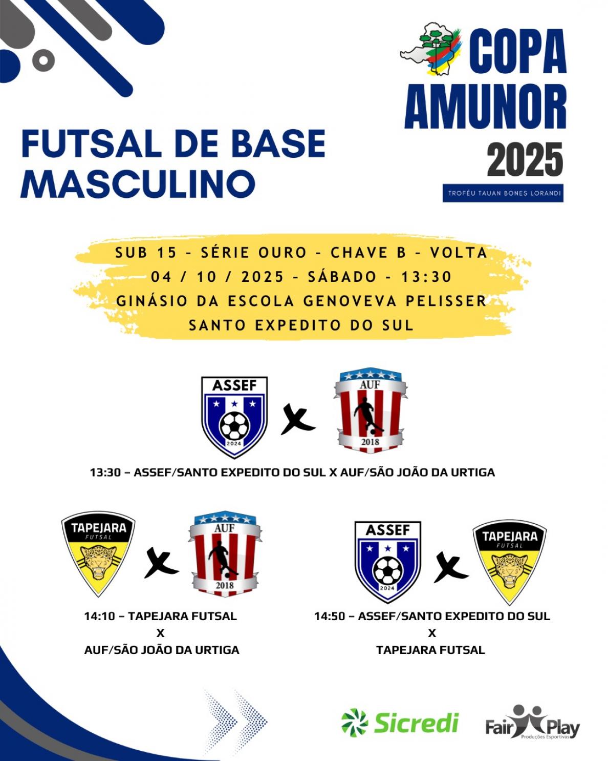 Neste sábado, 4 de outubro, o Ginásio de Esportes de Santo Expedito do Sul recebe os jogos da Copa Amunor 2025 (Troféu Tauan Bones Lorandi), válidos pela Série Ouro, Chave B (volta) da categoria Sub-15 masculino.