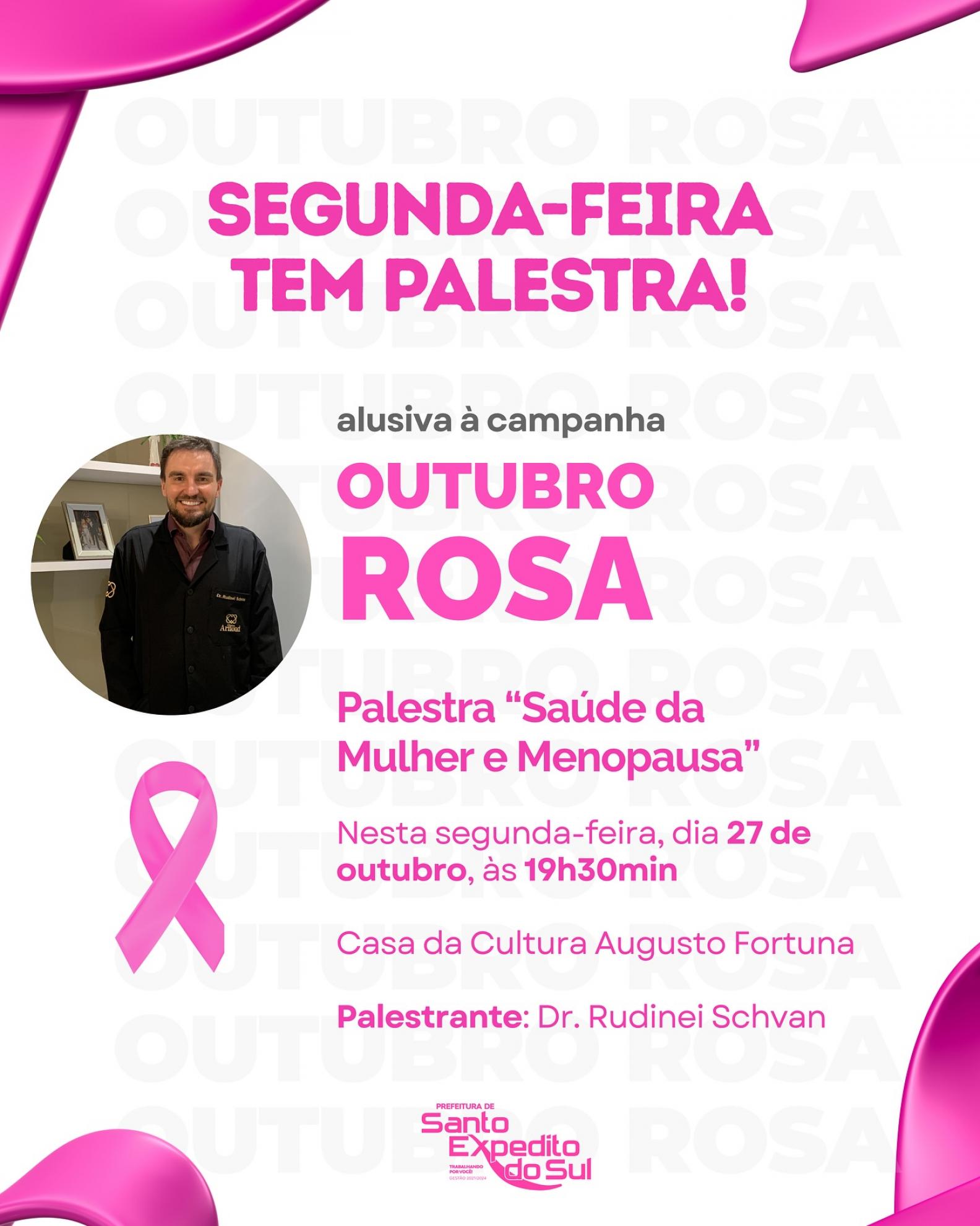 O evento será realizado na segunda-feira, dia 27 de outubro, às 19h30min, na Casa da Cultura Augusto Fortuna, e contará com a presença do médico Dr. Rudinei Schvan, que ministrará a palestra “Saúde da Mulher e Menopausa”.