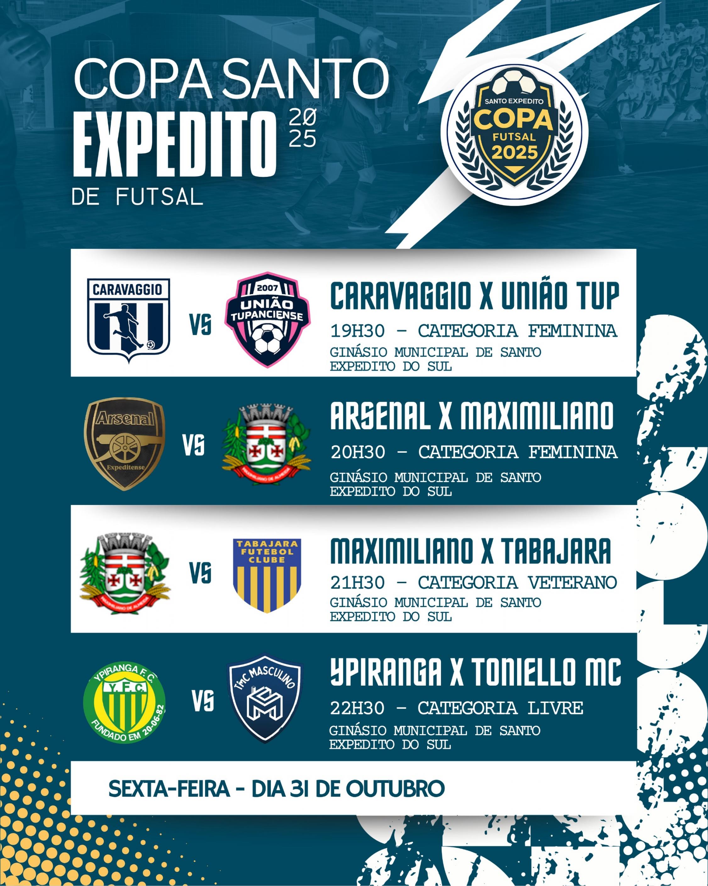 Nesta sexta-feira, dia 31 de outubro, mais quatro jogos movimentam a Copa Santo Expedito de Futsal 2025, com disputas nas categorias Feminina, Veterano e Livre, no Ginásio Municipal de Santo Expedito do Sul. Confira os confrontos da rodada: