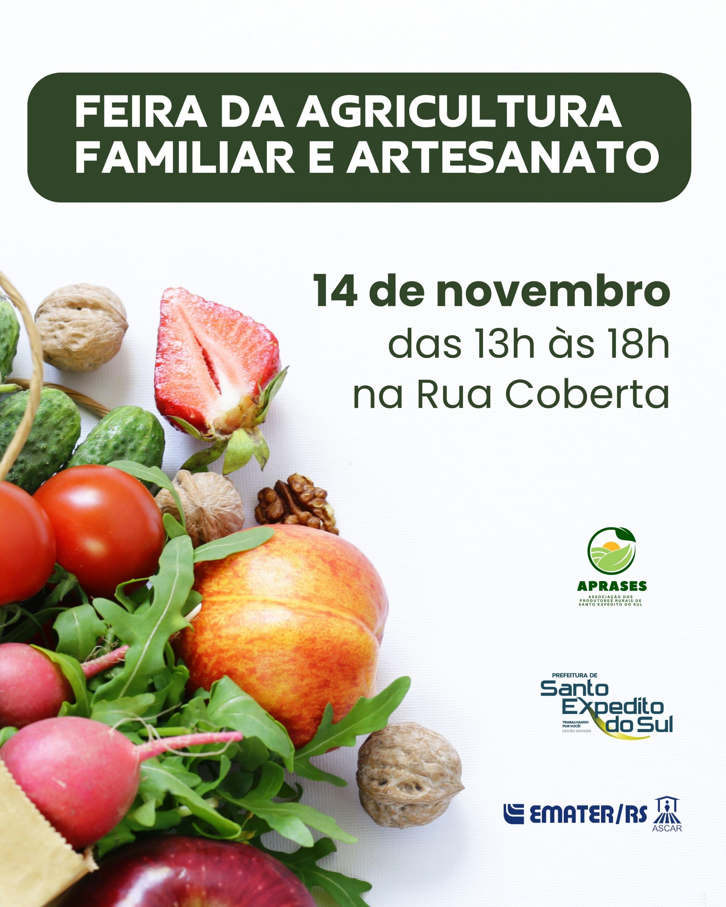 Nesta sexta-feira, dia 14 de novembro, ocorre mais uma edição da feira da agricultura familiar e artesanato. Os produtores estarão disponíveis para comercializar os seus produtos na Rua Coberta, das 13h às 18h. A comunidade está convidada a prestigiar.