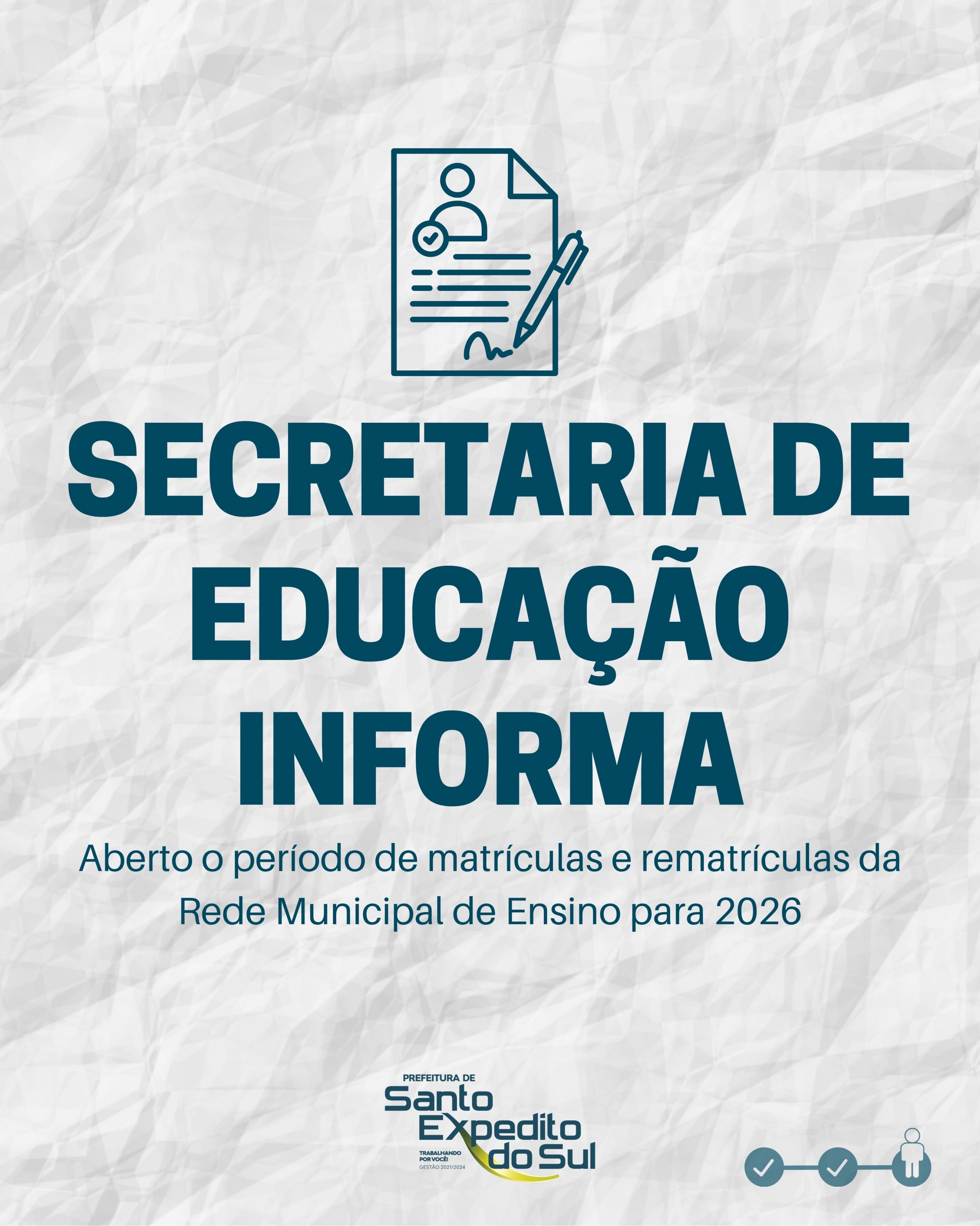 A Administração Municipal de Santo Expedito do Sul, por meio da Secretaria Municipal de Educação e Cultura, informa que a partir desta segunda-feira, dia 17 de novembro, está aberto o período de matrículas e rematrículas para o ano letivo de 2026 na Rede Municipal de Ensino. O processo está regulamentado no edital assinado pelo prefeito Vantuir Dutra e pela secretária de Educação, Bruna Zotti Prandi de Lima, conforme Decreto nº 2656.