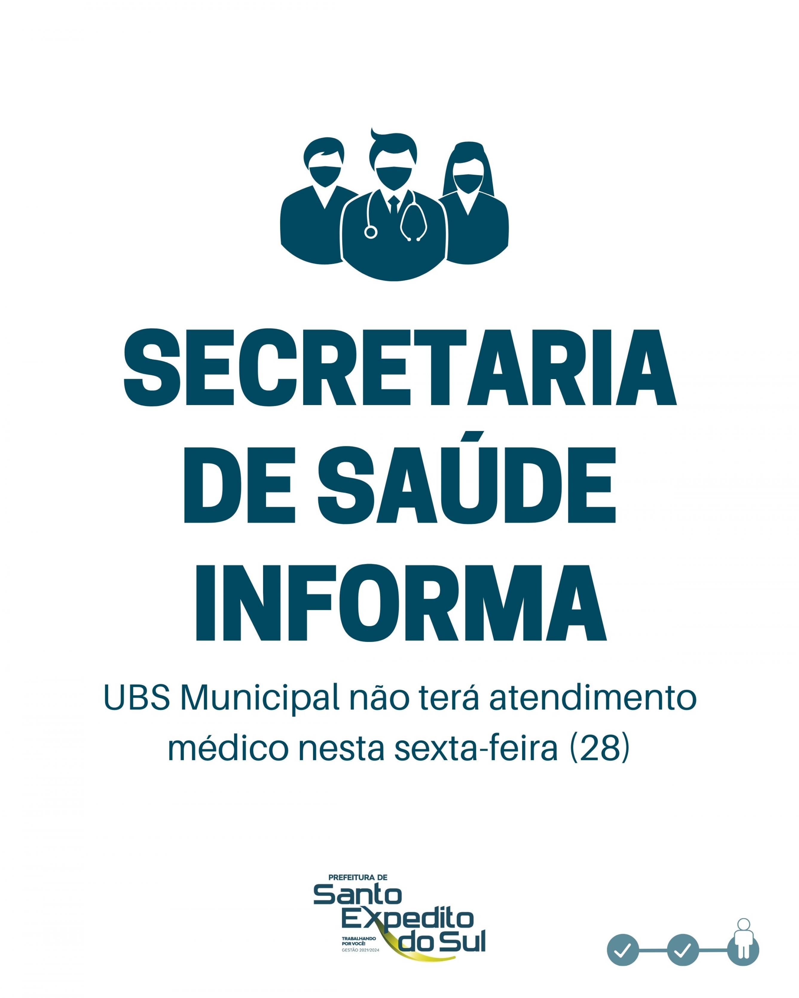 A Secretaria Municipal de Saúde de Santo Expedito do Sul informa que a UBS Municipal não contará com atendimento médico na sexta-feira, dia 28 de novembro, devido à participação do profissional em capacitação. A ação integra o processo de atualização e aperfeiçoamento contínuo dos serviços oferecidos à população.