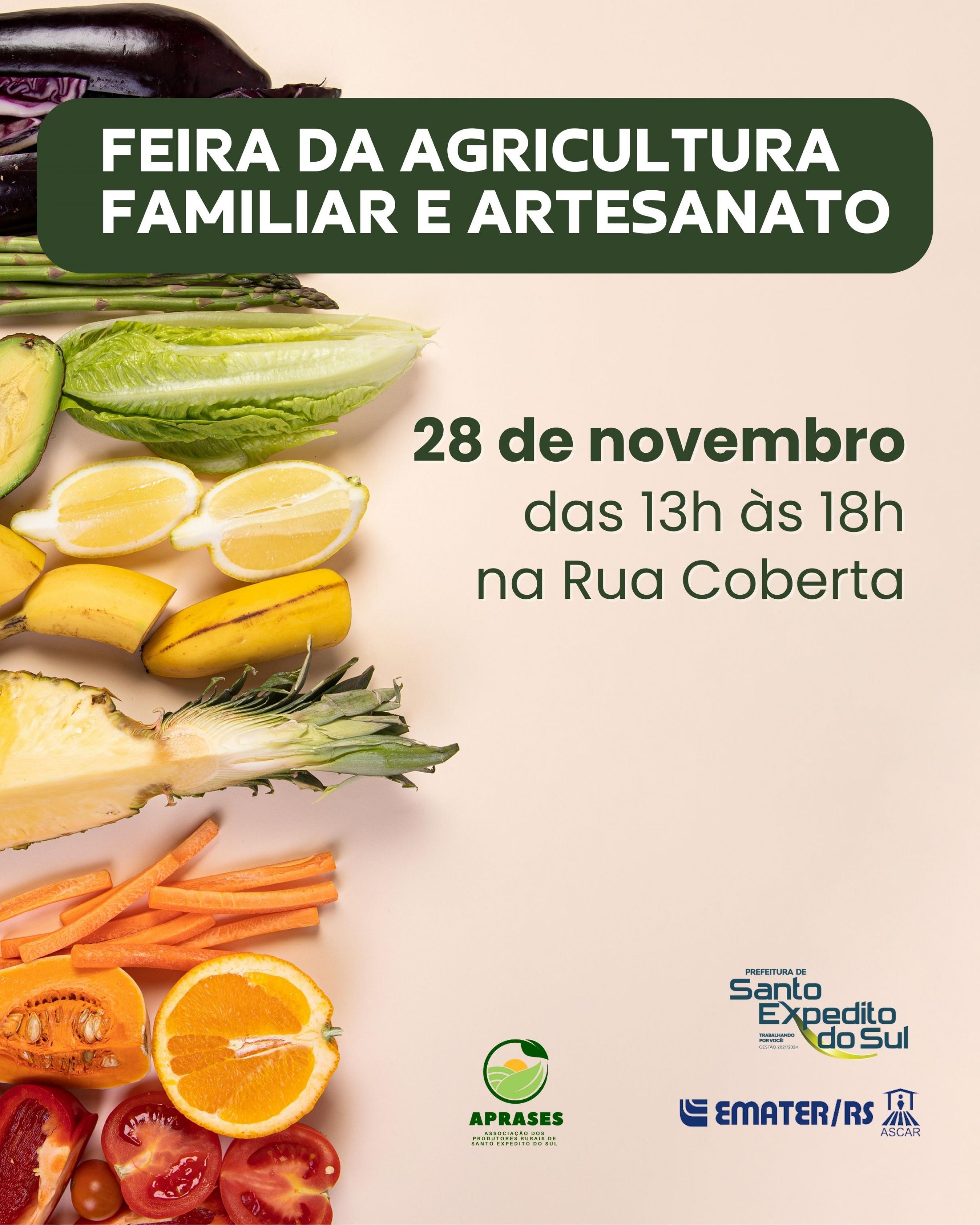 Nesta sexta-feira, dia 28 de novembro, ocorre mais uma edição da feira da agricultura familiar e artesanato. Os produtores estarão disponíveis para comercializar os seus produtos na Rua Coberta, das 13h às 18h. A comunidade está convidada a prestigiar.