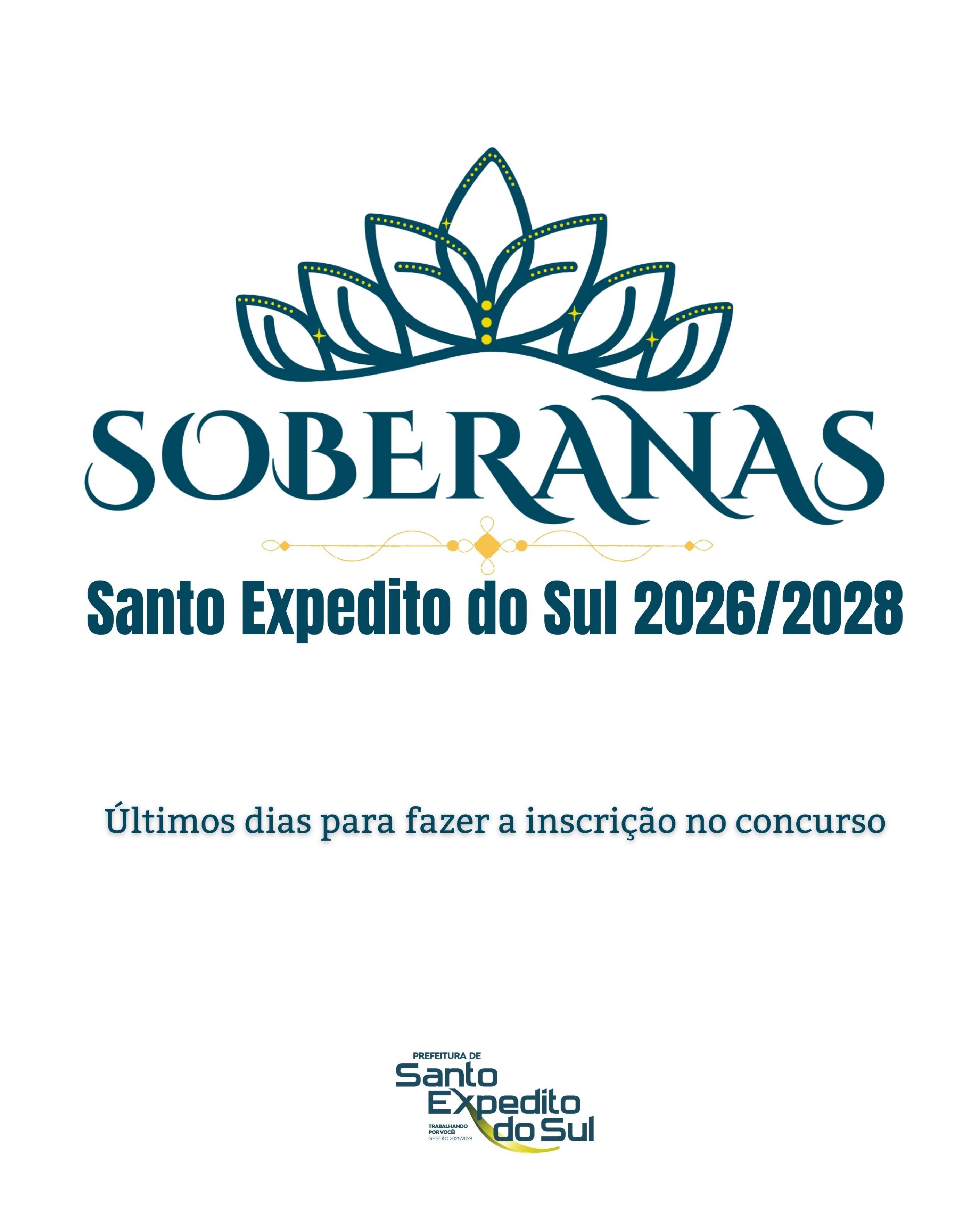A Administração Municipal de Santo Expedito do Sul informa que segue até o dia 25 de fevereiro, as inscrições para o Concurso de Escolha das Soberanas 2026/2028, um momento especial que valoriza a mulher expeditense e fortalece a identidade, a cultura e o amor pelo nosso município.