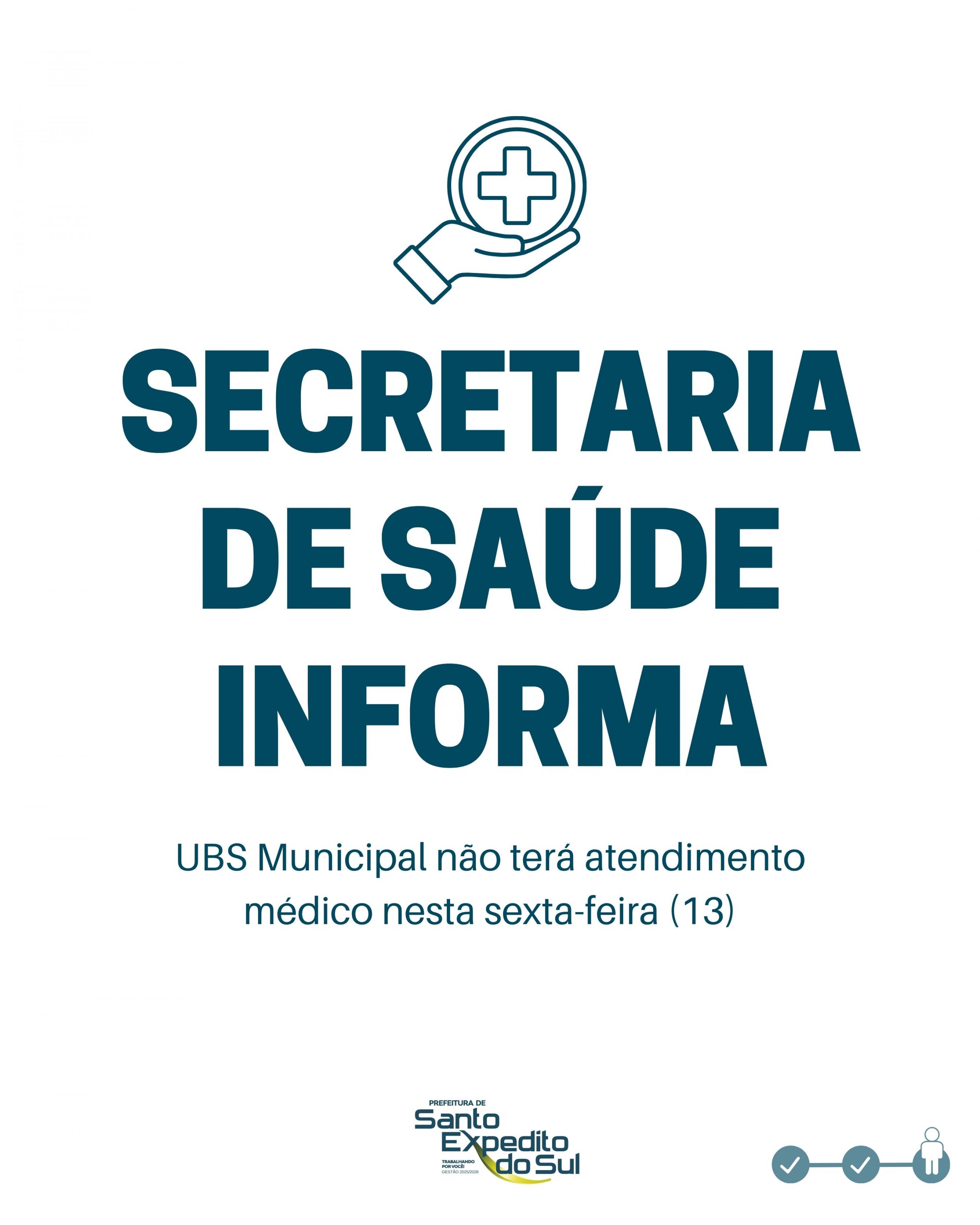A Secretaria Municipal de Saúde de Santo Expedito do Sul informa que a UBS Municipal não contará com atendimento médico na sexta-feira, dia 13 de março, devido à participação do profissional em uma importante capacitação. A ação integra o processo de atualização e aperfeiçoamento contínuo dos serviços oferecidos à população.